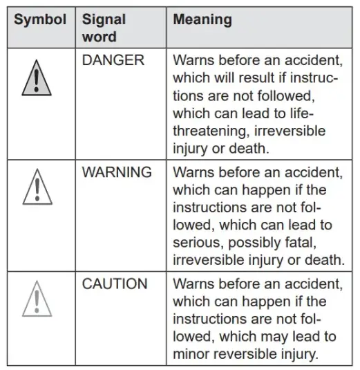 • The following table describes the icons used in these oper-ating instructions that are used for imaging of the danger-ous situation in connection with the symbol of the threat level.