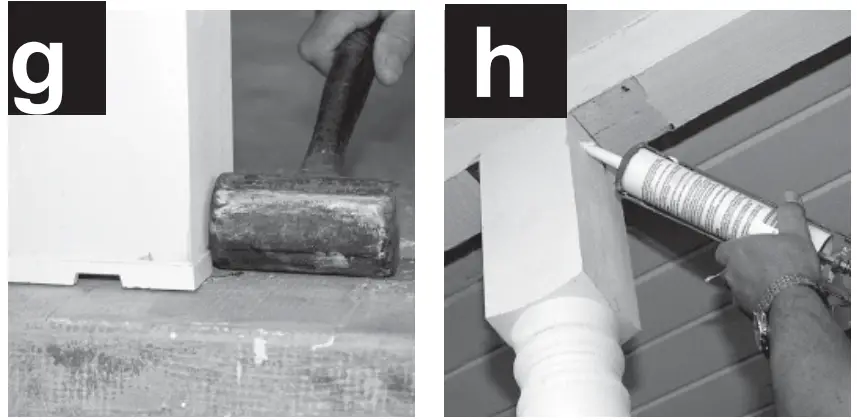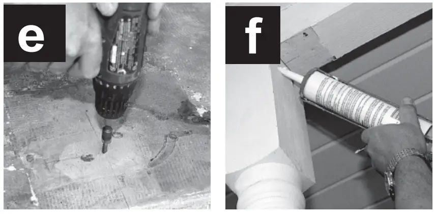 - Erect column and set into position under the beam. If the beam was raised for column replacement, lower the beam onto column. Using non-corrosive screws, fasten Post Saver mounting block to the deck. At the top, drill holes for attaching column to beam, then caulk [j] before using screws to secure.