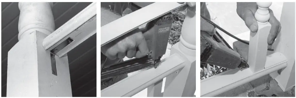 Cut rail and balusters to length. If using wood rail and balusters, prime all surfaces, paint all surfaces, then seal ends with silicon or exterior-grade caulk, allowing to cure fully before assembly. If attaching rail with L-brackets, remember that all holes drilled into the post should be caulked before placing screws, and any areas that are chiseled for the brackets should be primed, painted and caulked before attaching.