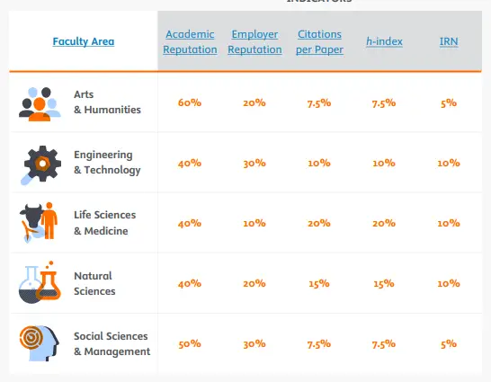 As research cultures and publication rates vary significantly across academic disciplines, the QS World University Rankings by Subject applies a different weighting of the four indicators in each subject.