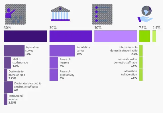 THE uses 13 performance indicators to position more than 1,799+ institutions worldwide. These performance indicators are grouped into five areas (as shown to the right).