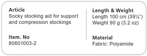 Socky short is the perfect stocking aid for both short and knee long socks including flight socks. It consists of a plastic base with two hooks under a pre-folded nylon fabric.