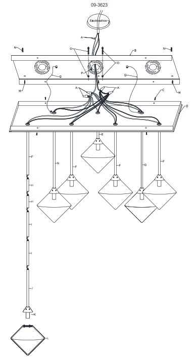 EXTENSIONS: Screw the threaded top of one extension into the threaded opening at the base of the next extension. To prevent damage to the wire, make sure the wiring is pulled taught when threading the extensions together. - After all desired extensions have been added, re-thread the socket cups (K) to the lowest point of the tube, and guide all of the wiring through to the canopy.