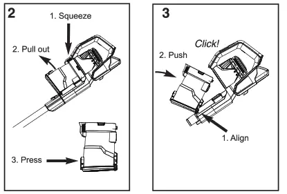 • Place battery pack into charging dock; Plug charger into power outlet and then into charger port on dock. Three indicator lightes on charging dock stop blinking when fully charged.