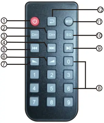 - built-in player digital function keys: MP3/FM player, can be directly by a number Keys, select the corresponding song or radio. Note: when choosing a 1-9 number, the corresponding After the display number is gone, it is only available for a number of other digits, or the number will be Superimposed. For example, if 1: is 5, 5, 5, or play Fifth songs or radio stations, if the continuous multi press, The number will be superimposed, which will be played on the same number. A song or radio. For example, 2: press 1, then press 2, will show 12, that is, the Play twelfth songs, and so on.