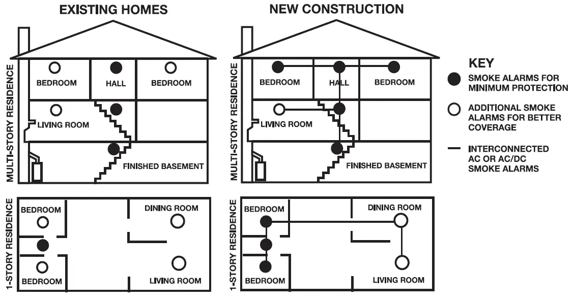 Installing Smoke Alarms in Single-Family Residences The National Fire Protection Association (NFPA), recommends one Smoke Alarm on every floor, in every sleeping area, and in every bedroom. In new construction, the Smoke Alarms must be AC-powered and interconnected. See “Agency Placement Recommendations” for details. For additional coverage, it is recommended that you install a Smoke Alarm in all rooms, halls, storage areas, finished attics, and basements, where temperatures normally remain between 40˚ F (4.4˚ C) and 100˚ F (37.8˚ C). Make sure no door or other obstruction could keep smoke from reaching the Smoke Alarms. More specifically, install Smoke Alarms: