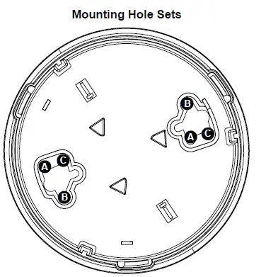 Hold the mounting bracket against the ceiling (or wall) so the two clusters of universal mounting holes are aligned approximately at 9:00 and 3:00 o’clock positions. See image. Choose one of the three sets of holes shown, A, B, or C