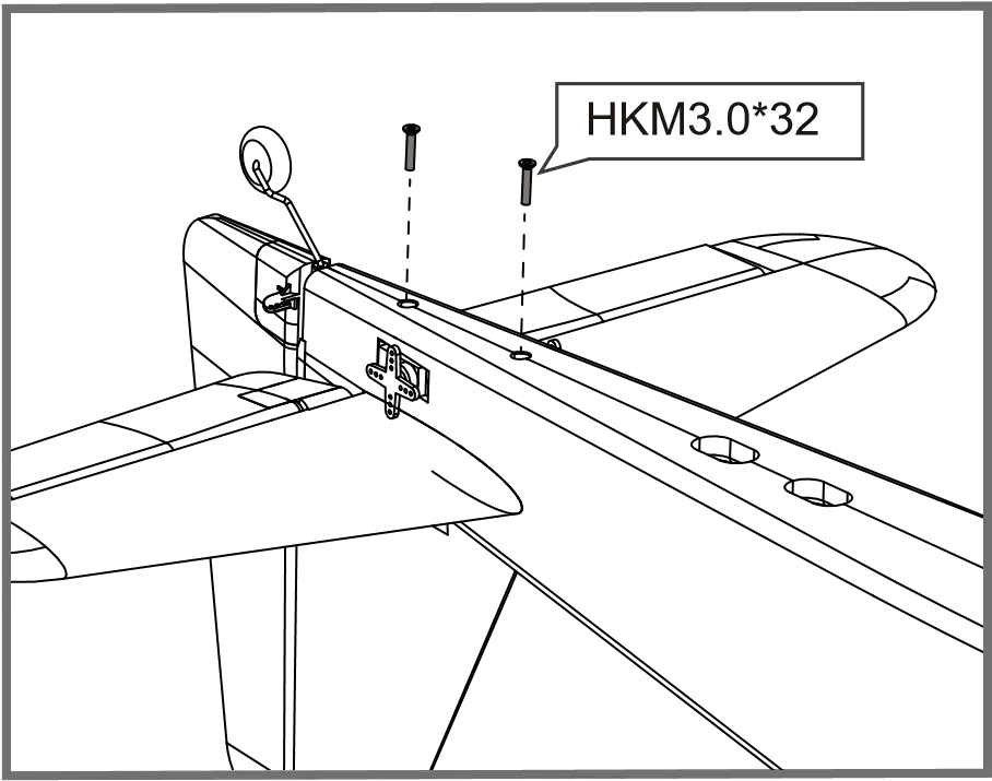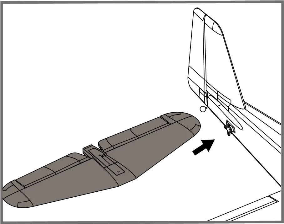 - Insert the horizontal stabilizer into fuselage in the direction of the arrow as shown. Secure the horizontal stabilizer with included screws.