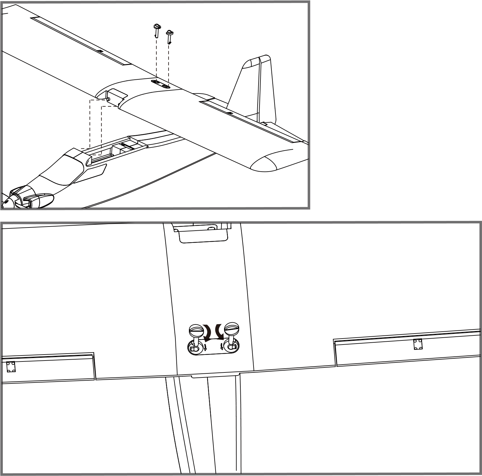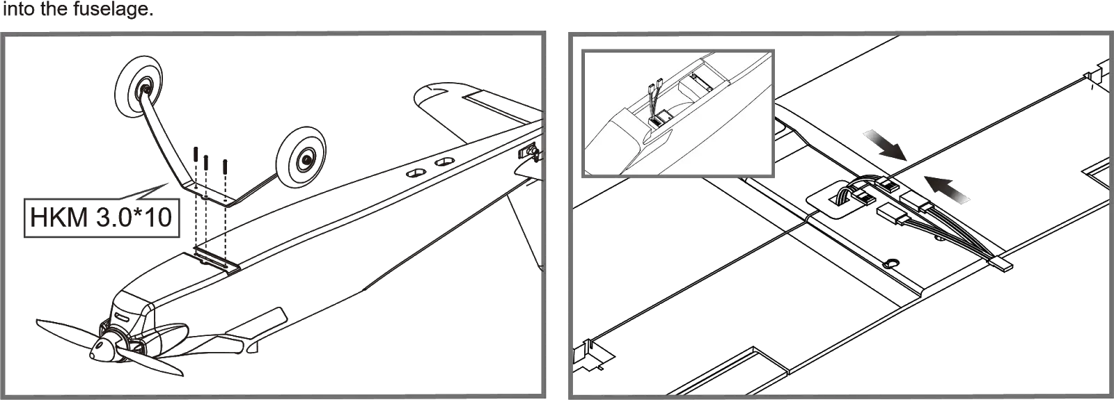 - Fix the floats set with struts on the bottom of fuselage with screws as shown.