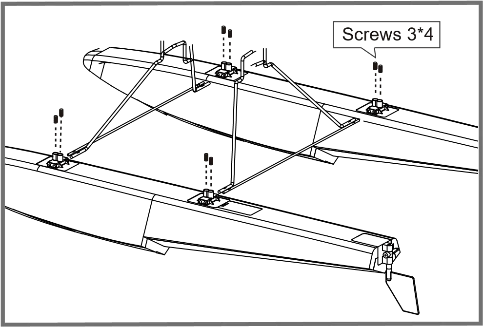- Install the struts onto the floats as shown- using the hardware provided with the float set. Secure the float assembly using screws.