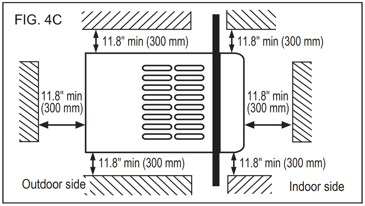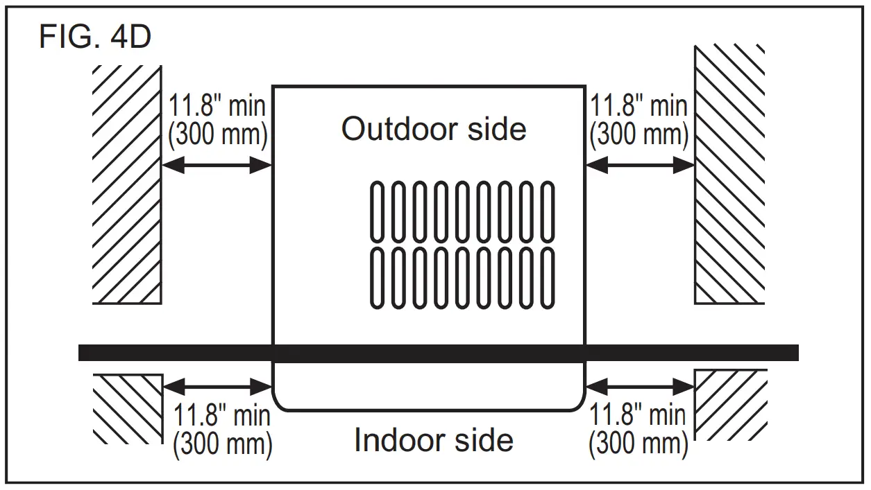 Side louvers and the rear of the air conditioner must have clear air space to allow enough airflow through the condenser, for heat removal. The rear of the unit must be outdoors, not inside a building or garage. There should be at least 11.8 inches (300mm) clearance around the unit. See FIG. 4C & FIG. 4D.