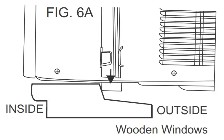 If Storm Window Frame must remain, be sure the drain holes or slots are not caulked or painted shut. Accumulated Rain Water or Condensation must be allowed to drain out. - Keep a firm grip on the air conditioner, carefully place the unit into the window opening so the bottom of the air conditioner frame is against the window sill (FIG. 6A & FIG. 6B). Carefully close the window behind the top rail of the unit.