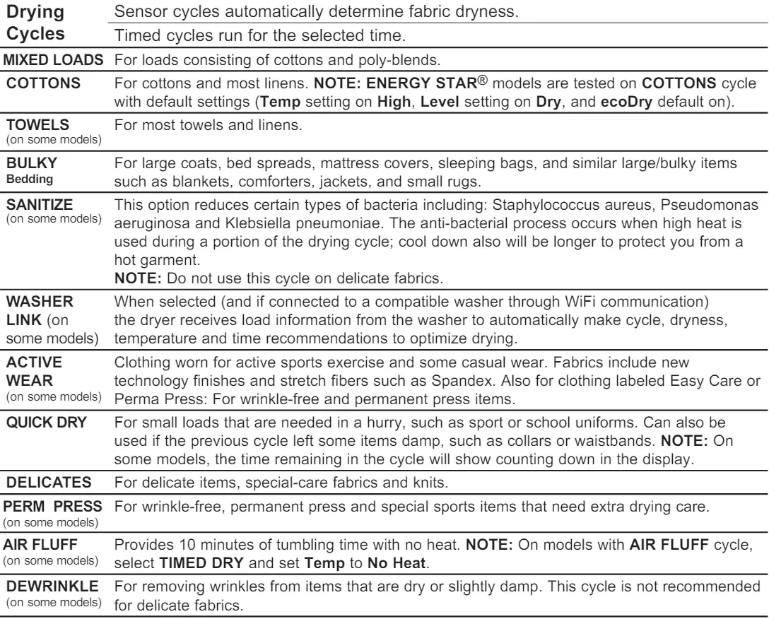 Reduce Static (on some models) When selected, the dryer will spray a mist of water onto the load, at the end of the drying cycle, to reduce static. This option is not available with BULKY, SANITIZE or STEAM cycles. - Damp Alert (Damp Alert/WiFi pad) (on some models)