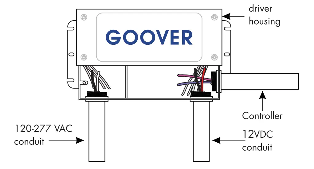 - Insert the 120-277 VAC power into the driver housing from the electrical panel . Followed by bringing the 12V DC low voltage wires from the LEDs into the driver housing.