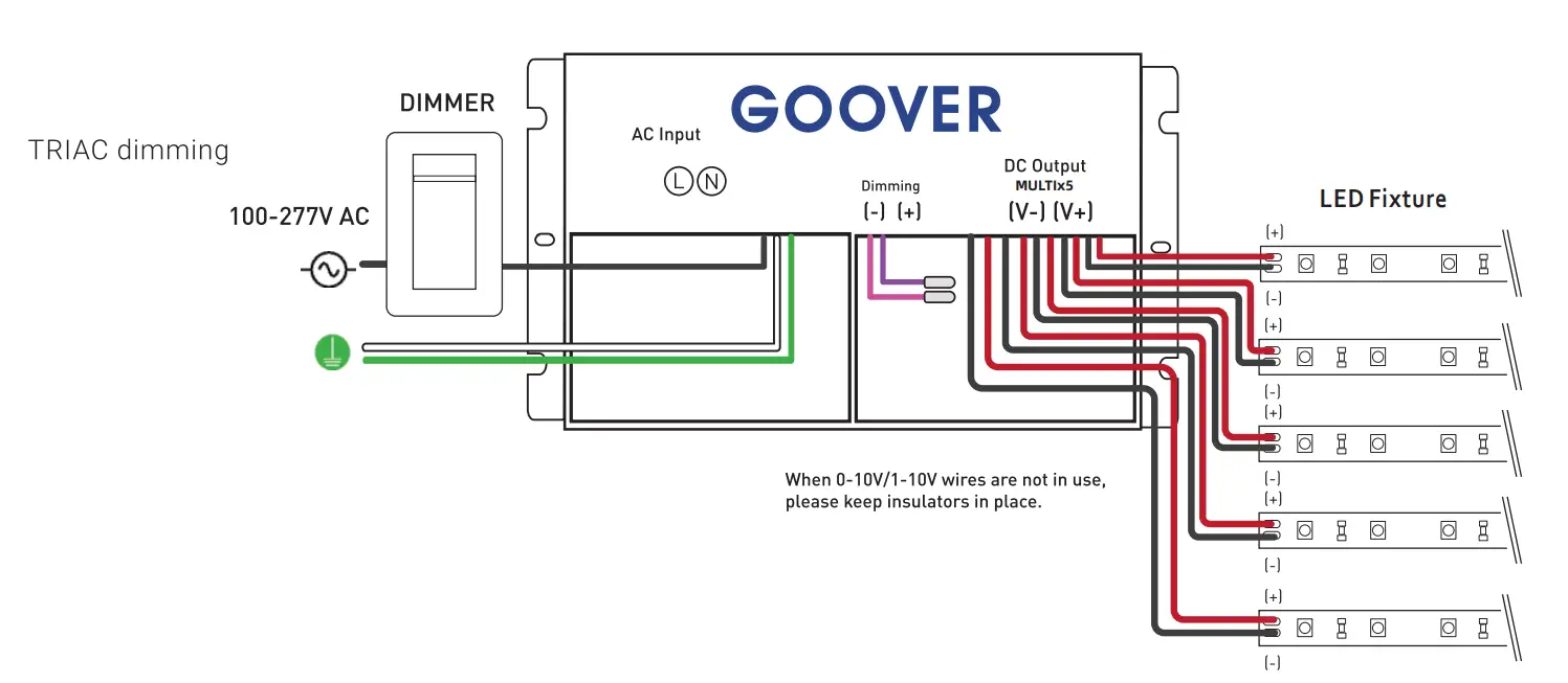 - Total wattage of LED fixtures connected to driver must not exceed wattage rating of this unit.