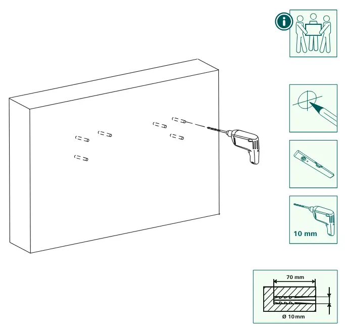 - Before installation, check that the wall you have chosen is suitable for the weight to be Also make sure that there are no electric, water, gas or other lines running through the wall at the mounting site.