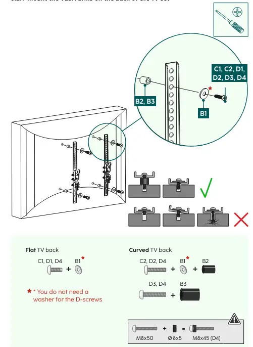 - Note the combination of screw, washer and spacer listed above for your flat or curved