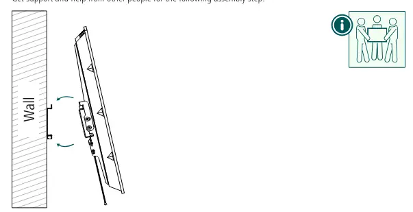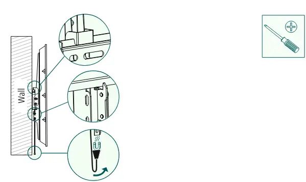 Hang the TV set with the mounted VESA arms on the wall bracket as shown above until it audibly engages.