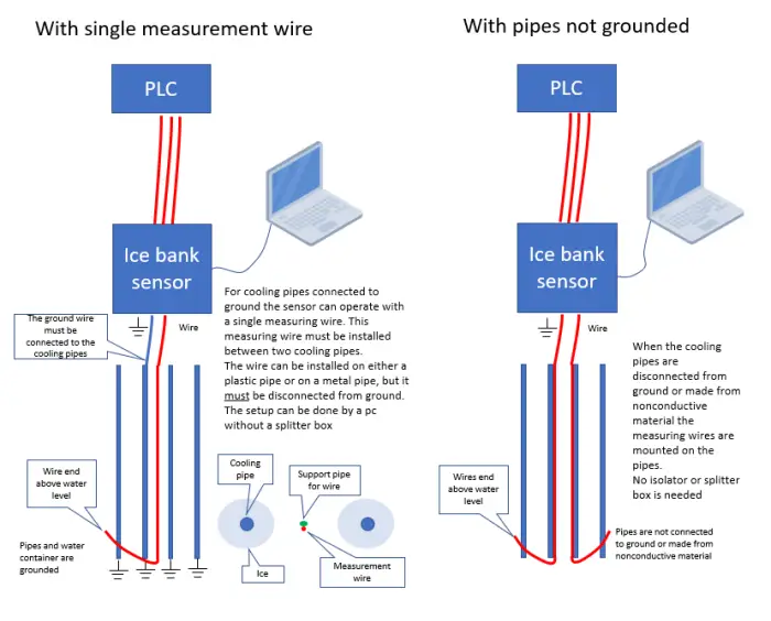 - The box is mounted on the ice bank with the ground wire connected to a pipe. The other named “wire” is connected to the wire mounted between the cooling pipes. A plastic pipe can be used to support it, or a metallic rod/pipe can be used. If a metal rod/pipe is used it must be insulated from ground.