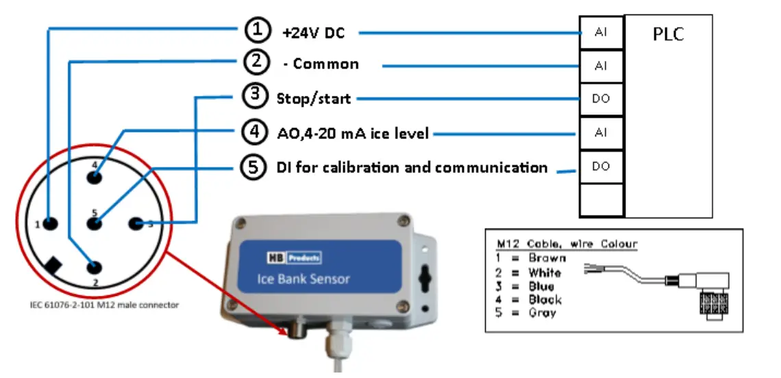 The connection to the PLC is done according to the diagram above using a cable with a M12 Female connector. Stop start pin3 and Digital input for calibration pin5 is not relevant for the ice bank.