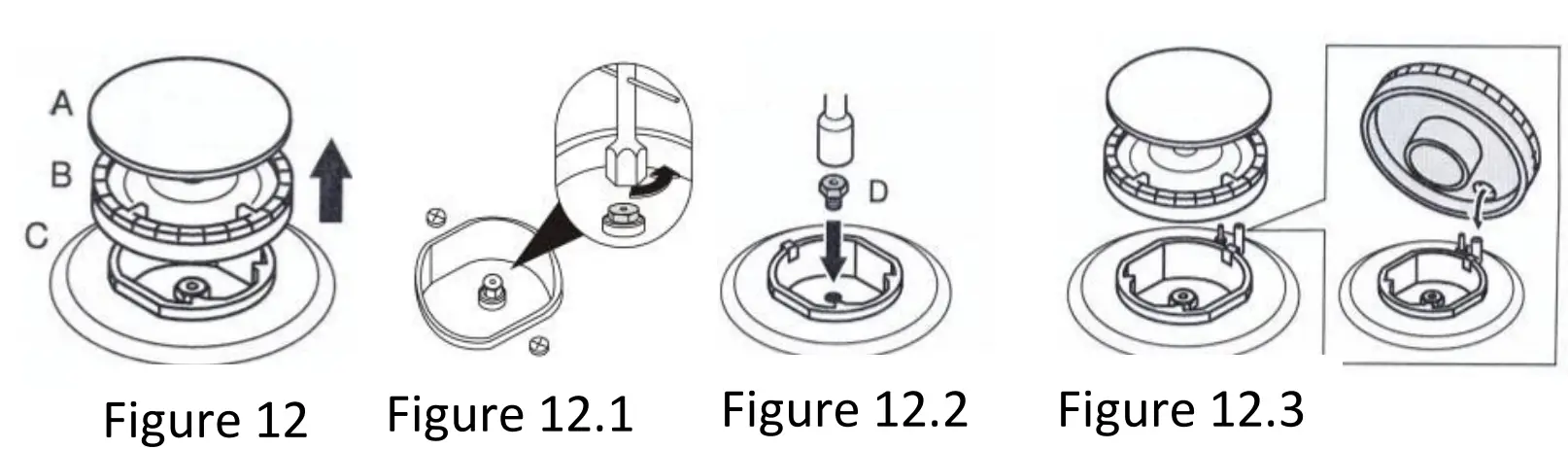 Turn on the burners respectively after conversion and remove the button on the control panel and set the flame length by tightening or loosening the screw on the gas valve (12.4 cock) or in the valve shaft.