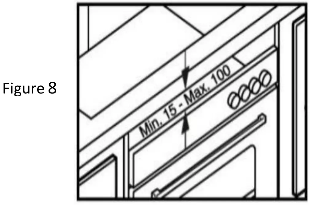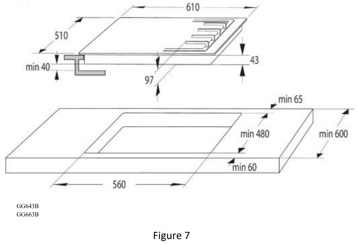 Figure 7 shows the size to which the counter will be cut for installation of the range. Place the prepared range into the counter cut to these sizes. If you will use the range on the built-in oven, observe the figures 8 and 9 for proper air circulation between the oven and range.