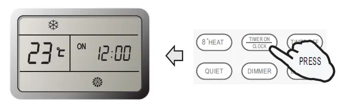 Result: A “beep” can be heard. The TIMER indicator on the indoor unit lights up. “ON” stops flashing. - After the set timer is displayed for 5 seconds, the clock will be displayed on the LCD of the remote controller instead of a set timer.