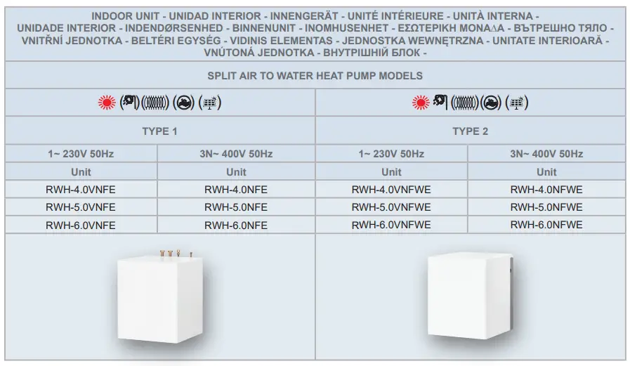 Please, check, according to the model name, which is your heat pump type, how it is abbreviated and referred to in this instruction manual. This Instruction Manual is only related to Indoor Units RWH-(V)NF(W)E combined with Outdoor Units RAS-WH(V)NP(E) and its accessories DHWS-S-2.7H2E Water Tank.