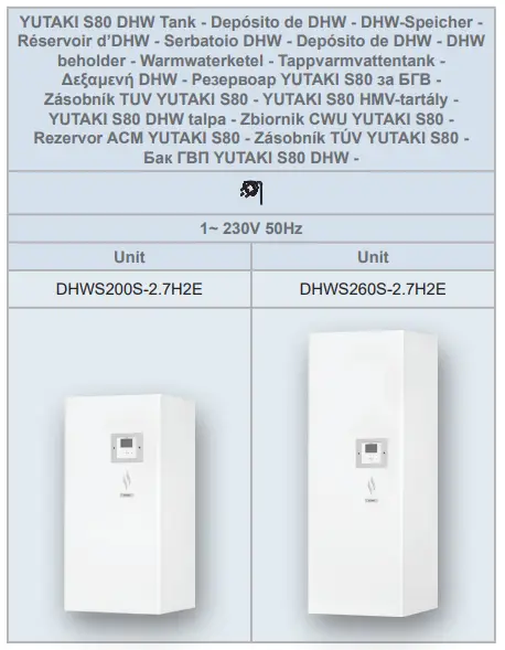 - In “TYPE 2: Version for operation with Hitachi DHW tank”, the domestic hot water tank of model DHWS200S-2.7H2E and DHWS260S2.7H2E is required. The DHWT has to be ordered separately. The unit controller (PC-ARFHE) is factory-supplied with the DHWT (integrated in the font cover). The tank can be installed in 2 ways: on top of the indoor unit (integrated installation) or next to it. In this second case, the specific accessory kit for installation (ATW-FWP-02, ordered as an accessory) is required.