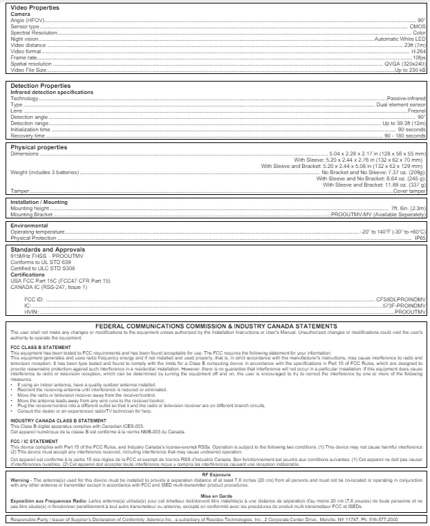 | The PROOUTMV is a battery-powered, wireless outdoor motion detector with a built-in video camera is intended for use with ProSeries Control Panels. The detector is powered by three C123A lithium batteries that provide up to 4 years of battery life (typical use).