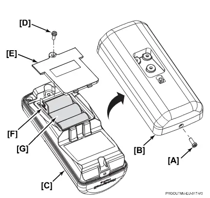 Enrollment and RF testing should be done while the detector is in its intended mounting location to ensure good communication between the Control Panel and the device. NOTE: For detailed programming instructions refer to the Installation Instructions for the Control Panel with which this device is used. 1. Remove the set screw [A] that secures the rear housing [B] to the front housing [C]. Remove the rear housing. 2. Remove the screw [D] that secures the battery cover [E] to the front housing [C]. Remove the battery cover. 3. When prompted, perform one of the following: · Carefully remove (and discard responsibly) the battery tab [F]. · Insert the batteries [G]. · If powered, open and close the back housing again. 4. The LED on the front flashes rapidly at power up. 5. Reassemble the detector. |