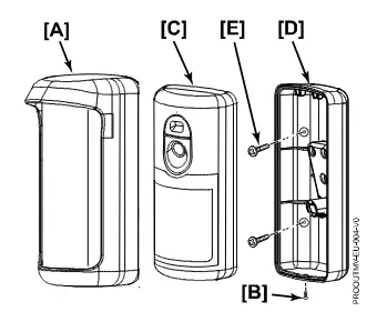 1. Remove the water protection cover [A] from the detector. 2. Remove the set screw [B] that secures the detector front housing [C] to the rear housing [D] and carefully separate the housings. 3. Secure the rear housing to the wall in the desired location with screws [E]. NOTE: The detector can be mounted flat or angled on a wall: · W = Wall Mounting Holes · C = Corner Mounting Holes 4. Reassemble the detector front housing [C] to the rear housing [D] and secure with set screw [B]. 5. Install the water protection cover [A] on the detector. |