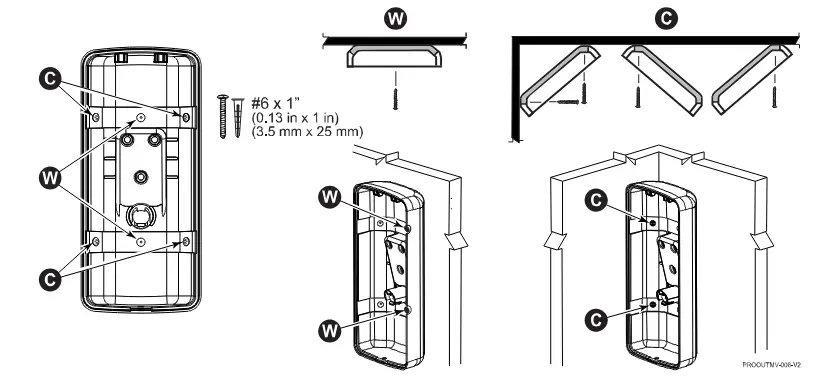| The detector can be mounted directly on a wall or with the PROOUTMV-MB mounting bracket (available separately). All programming and RF testing should be done while the detector is in its intended mounting location to ensure good communication between the Control Panel and the detector.