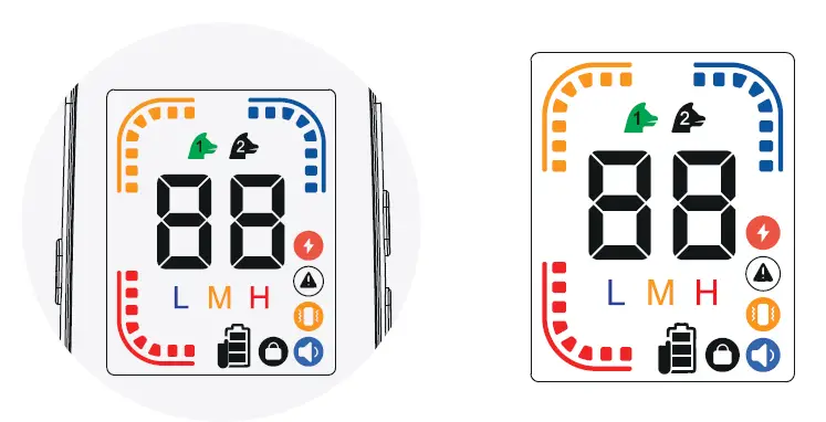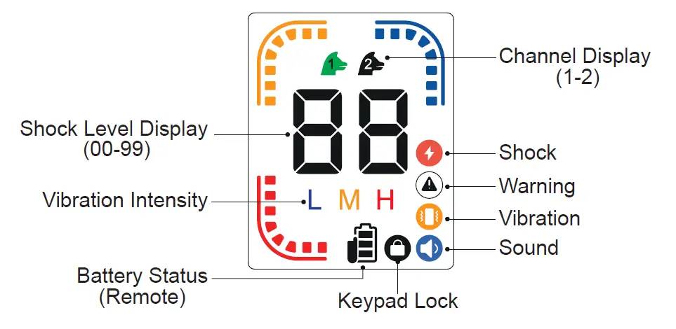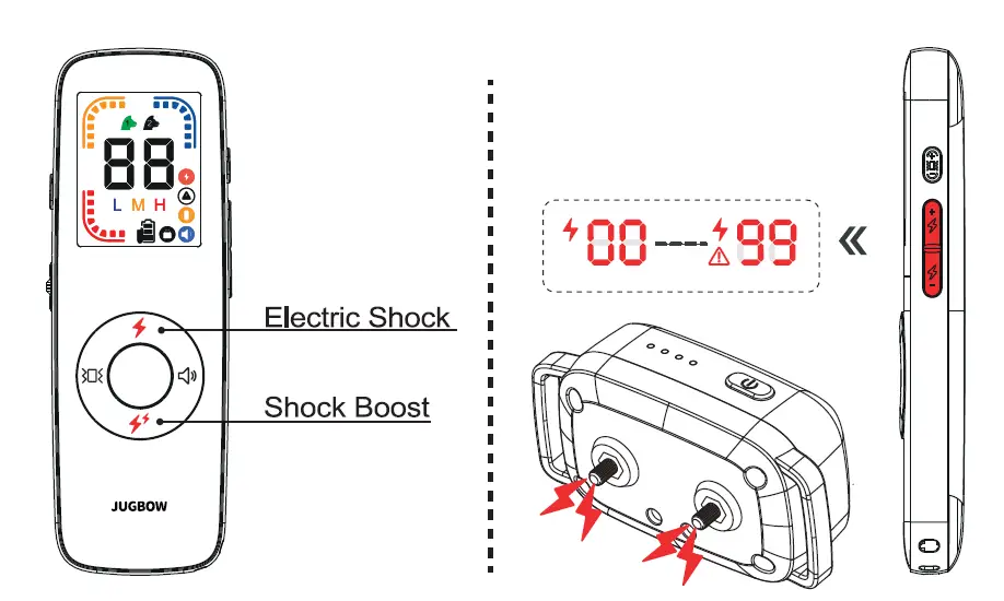 Adjust the shock level level by pressing the “+” “-” on the left side of the remote control
