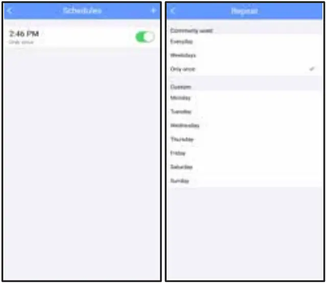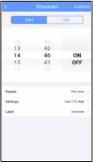 Weekly user can make an appointment to turn on or off AC on specific ime. User also can choosecirculation to keep. the AC under schedule control every week.