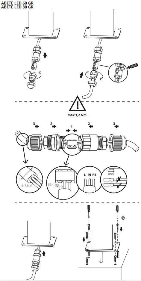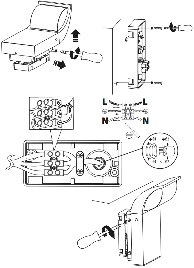 Technical changes reserved. Read the manual before mounting. Mounting should be performed by an appropriately qualified person. Any activities to be done with disconnected power supply. Exercise particular caution. Product has a protective contact/terminal. Failure to connect the protective lead may lead to electric shock. Mounting diagram: see pictures. Check for proper mechanical fastening and connection to electrical power prior to first use. The product can be connected to a supply network which meets energy quality standards as prescribed by law. To maintain the proper IP protection level, the right diameter of the power cable should be selected for the cable gland used in the product.