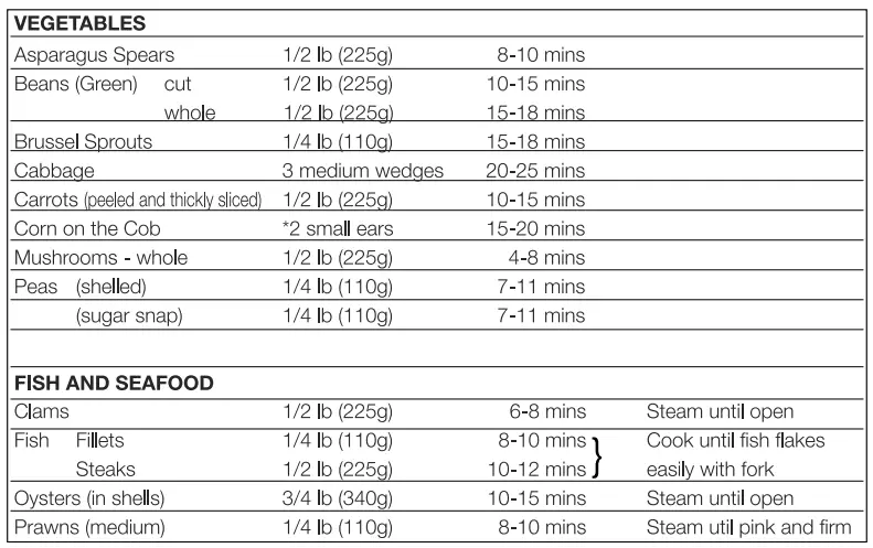 - Cooking times are approximate and are affected by size and temperature of food and the degree of cooking desired. Water amounts may adjusted