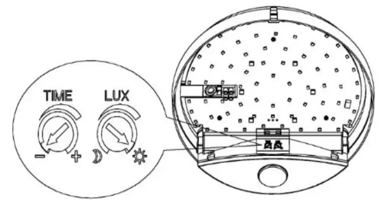 3. Turn the LUX knob to the minimum (MOON) position. If the ambient light level is higher than 3 LUX, the light will not turn on. If the ambient light drops to 3 LUX (DARK), the sensor will activate and the light will illuminate. If there is no motion within the sensor range, the light will turn off after the set time.