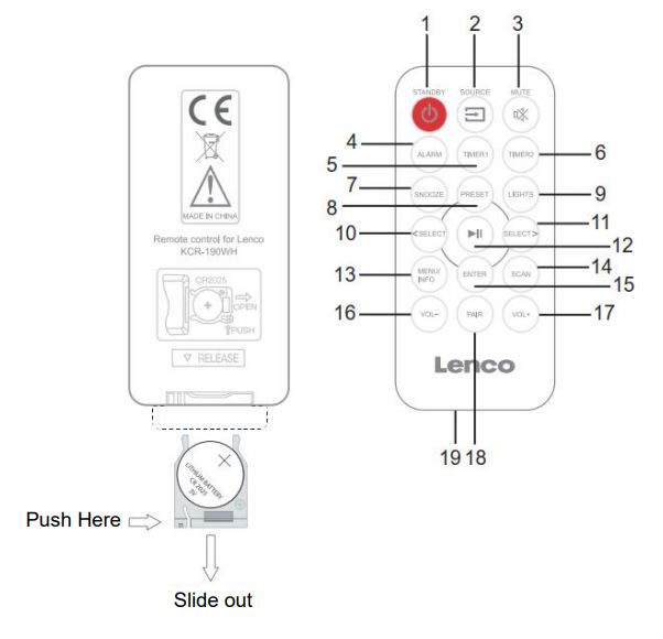 Turn on the Bluetooth function of your Bluetooth device and enable the search “Lenco KCR-190” from the device list. Pair the unit with your device Once connection success, the display will show Bluetooth Connected Hold “PAIR” button to cancel the collection