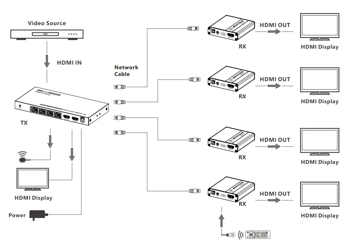 4. Distribute 1 HDMI source to 4 HDMI displays.