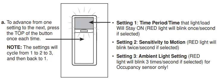 | Vacancy | When Manual ON, Automatic OFF lighting control is desired. | N/A | TOP or BOTTOM of button is pushed. OR User moves around within 30 secs of the light turning OFF. | TOP or BOTTOM of button is pushed. OR No motion is detected for the duration of the programmed time period. |