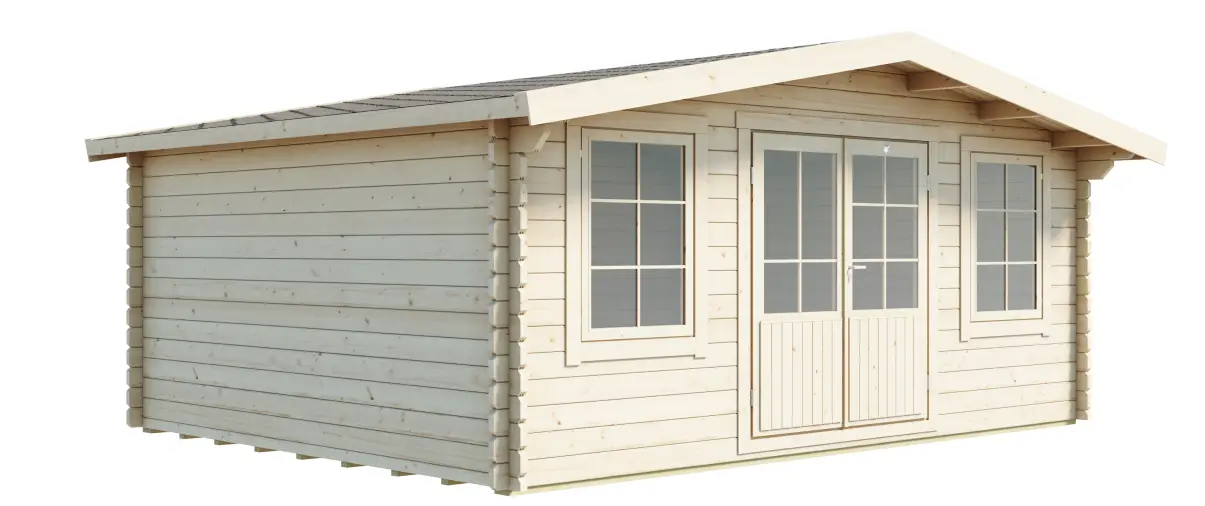 The most important aspect of the construction is a well-prepared foundation. It must be flat, completely level and devoid of any movement even after the assembly work. Take special care of these requirements when building on areas where the ground retains water. In all cases a concrete raft foundation is preferred. This spreads the constructions’ load over a wide area and suits all ground types. Your retailer can advise an alternative foundation method should a raft not be possible. When using a pier and beam foundation, the spacing of the columns (posts) shall not be greater than 60 cm. When using construction blocks, slabs or footings as foundation it should be made sure that the soil will not move during frozen ground conditions. We recommend placing the foundation on, for example, a compacted and evened out bed of gravel. Regardless of type of foundation it should be made sure that the subfloor construction is well ventilated. The foundation for the optional terrace must be level with the base for the cabin and be prepared carefully. If needed, seek advice from an expert or have a professional perform the foundation work Fasten the foundation beams to the foundation, for example with angle irons (not included). Foundation beams are protection treated but it is advisable to add a roofing felt strip (not included) or another insulator between the foundation and the beams to stop moisture from the foundation penetrating the timber. The outermost foundation beams should finish nearer each other than the log walls. There are two important reasons for this. 1. Rain water won’t wet the point of contact of the foundation beams and the lowest logs. 2. The outermost foundation beams offer support for the edge of the floor. In practice it means that the foundation shall be 5-10mm smaller than the log frame of the cabin.
