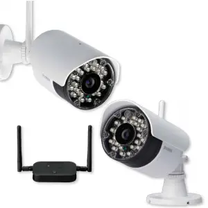 WIRELESS (LW2232PK2B) Includes | 2 x Indoor/outdoor cameras, 1 x Wireless receiver, 3 x Power adapters, 4 x Antennas |