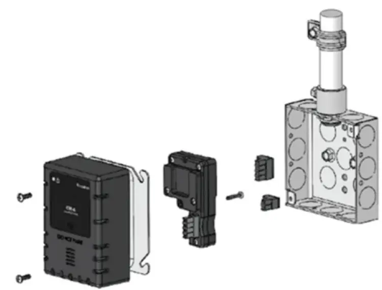 - Mounts behind the detector inside of a standard 4” x 4” electrical box