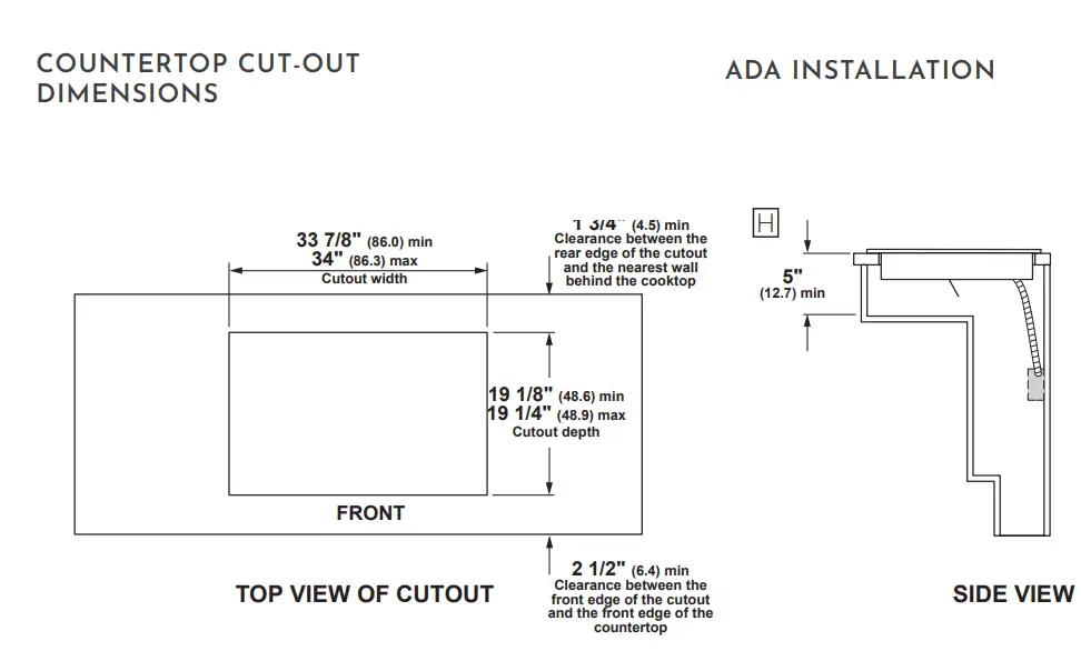 Ⓗ For Americans with Disabilities Act (ADA) forward approach installation: Minimum 5″ clearance between the top of the countertop and the enclosure. The enclosure must be made of at least 1/4″ thick wood material, and must have an access panel installed in order to provide access to the junction box and hold-down brackets, and to allow for service of the cooktop.