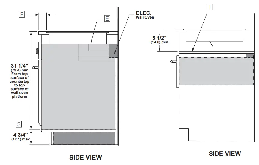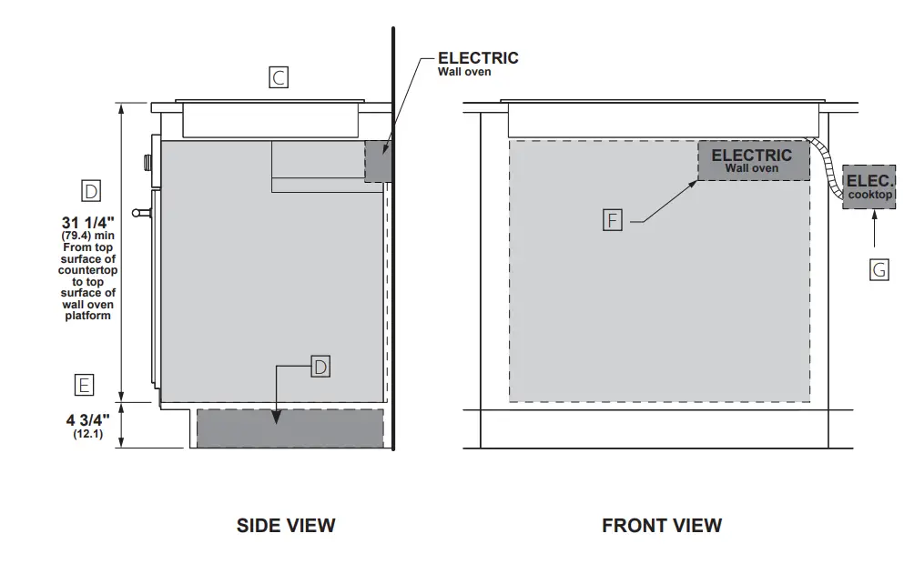 Ⓓ Maintain a minimum distance of 31-1/4″ from the top surface of the countertop to the wall oven platform to ensure that the cooktop and wall oven do not interfere with each other (see picture).