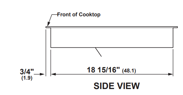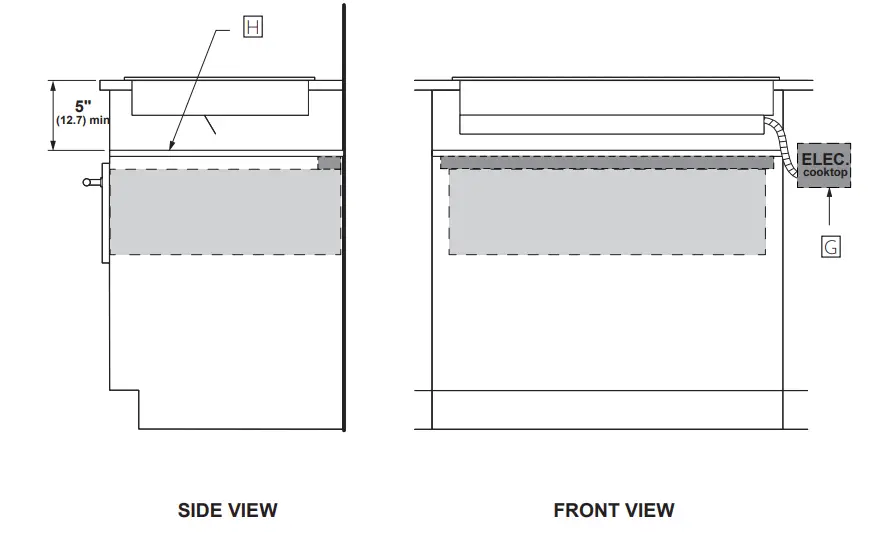 Ⓗ When installing the cooktop above a warming drawer, a solid barrier must be installed at least 5″ from the top of the countertop. Use any solid material such as 1/4″ thick plywood. Allow at least a 2″ air gap between the front of the barrier and the inside of the cabinet and at least 1/4″ air gap between the barrier and the top of the warming drawer.