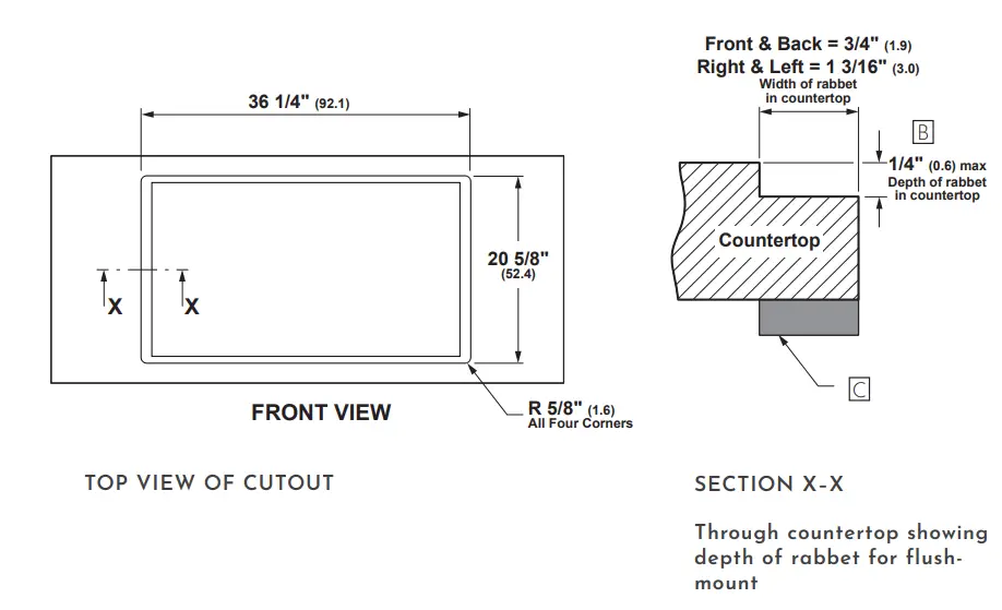 Ⓑ To avoid hot cookware from contacting the countertop surface, the cooktop should be installed at least 1/32″ higher than the countertop.
