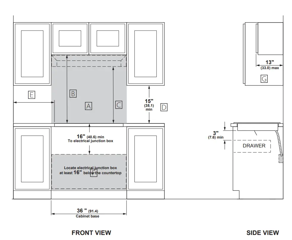 Ⓖ Maximum 13″ depth of unprotected overhead surfaces, when no ventilation hood or microwave oven is installed.