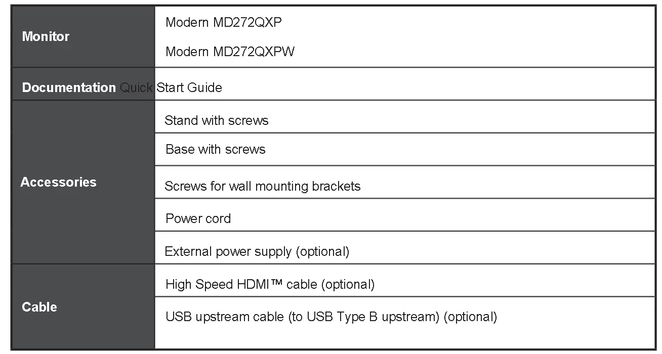 - Model: Modern MD272QXP (3PB1), Modern MD272QXPW (3PB1)